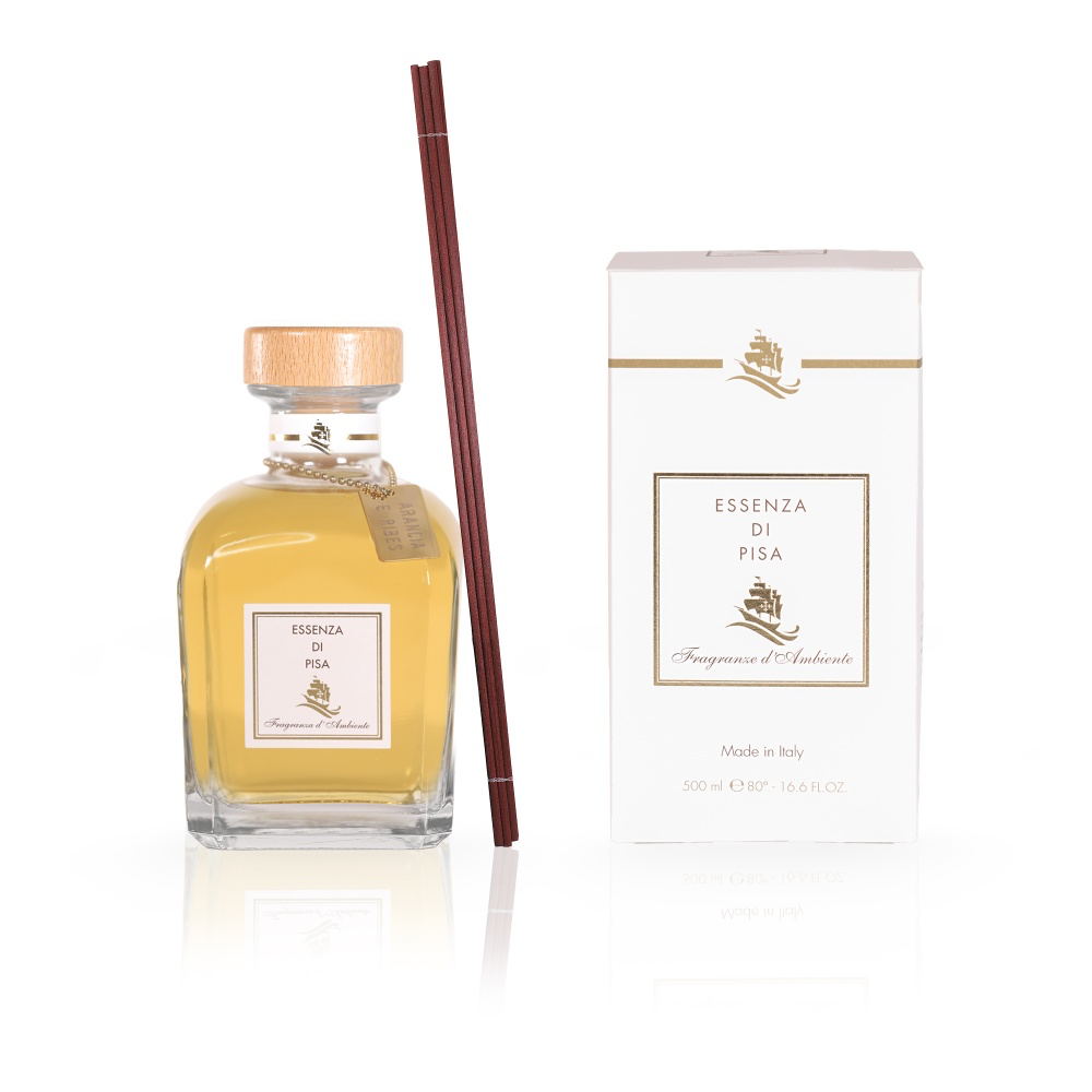 Profumatore completo confezionato – La confezione comprende: Profumatore da 500ml. in bottiglia di vetro – Diffusori in bamboo – Scatola in cartone.